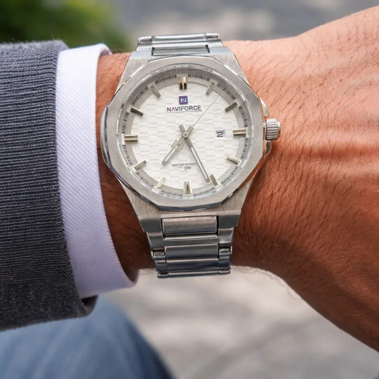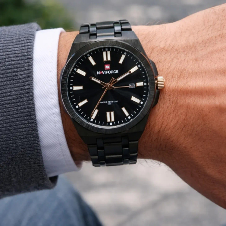 طراحی مردانه و شیک: اسپرت–کلاسیک، مناسب استفاده روزمره و رسمی. صفحه مشکی مینیمال با ایندکسهای برجسته و خوانایی بالا. بدنه و بند فلزی مشکی (استیل ضدزنگ با روکش مقاوم) دسته کوکی رزگلد برای جلوه لوکستر. نمایش تاریخ در موقعیت ۳. مقاومت در برابر آب تا (مناسب شستوشوی دست و رطوبت روزمره). موتور کوارتز دقیق با مصرف باتری کم. شیشه مقاوم در برابر خط و خشهای سطحی. سایز مناسب مچ مردانه (نه خیلی بزرگ، نه ظریف). گزینه عالی برای هدیه مردانه.
