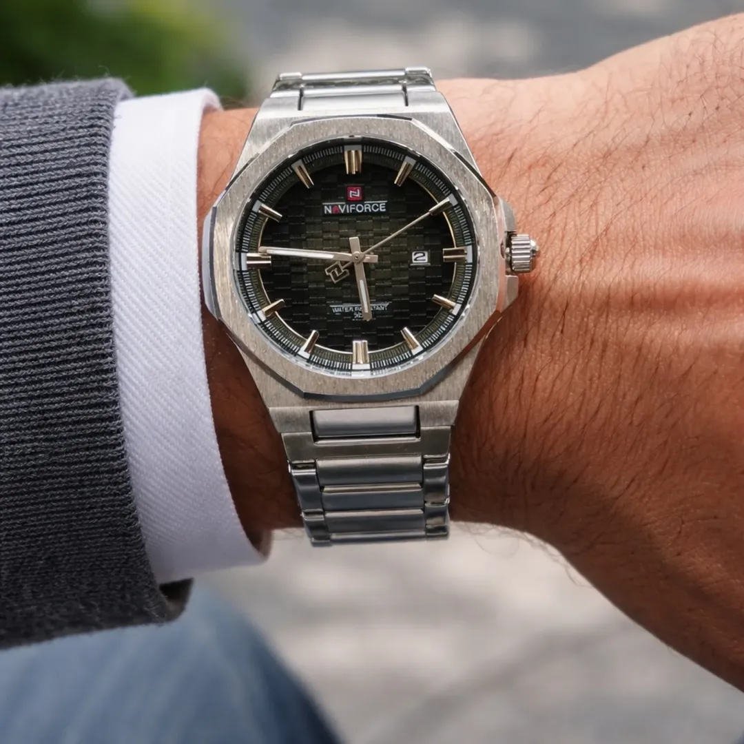 طراحی مردانه و شیک: اسپرت–کلاسیک، مناسب استفاده روزمره و رسمی. صفحه مشکی مینیمال با ایندکسهای برجسته و خوانایی بالا. بدنه و بند فلزی مشکی (استیل ضدزنگ با روکش مقاوم) دسته کوکی رزگلد برای جلوه لوکستر. نمایش تاریخ در موقعیت ۳. مقاومت در برابر آب تا (مناسب شستوشوی دست و رطوبت روزمره). موتور کوارتز دقیق با مصرف باتری کم. شیشه مقاوم در برابر خط و خشهای سطحی. سایز مناسب مچ مردانه (نه خیلی بزرگ، نه ظریف). گزینه عالی برای هدیه مردانه.